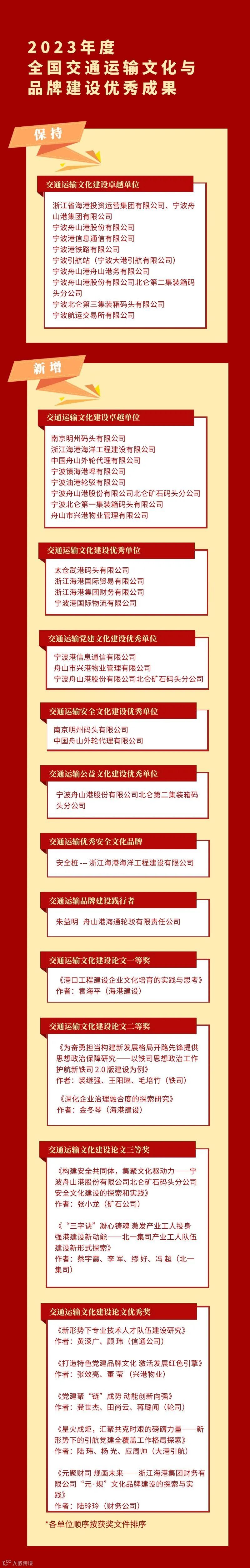 11月30日,中国交通企业管理协会印发《关于发布2023年度交通运输文化与品牌建设优秀成果的通知》,浙江省海港集团、宁波舟山港集团荣获“2023年度全国交通运输文化建设卓越单位”称号。这是集团连续第13年获得该殊荣。