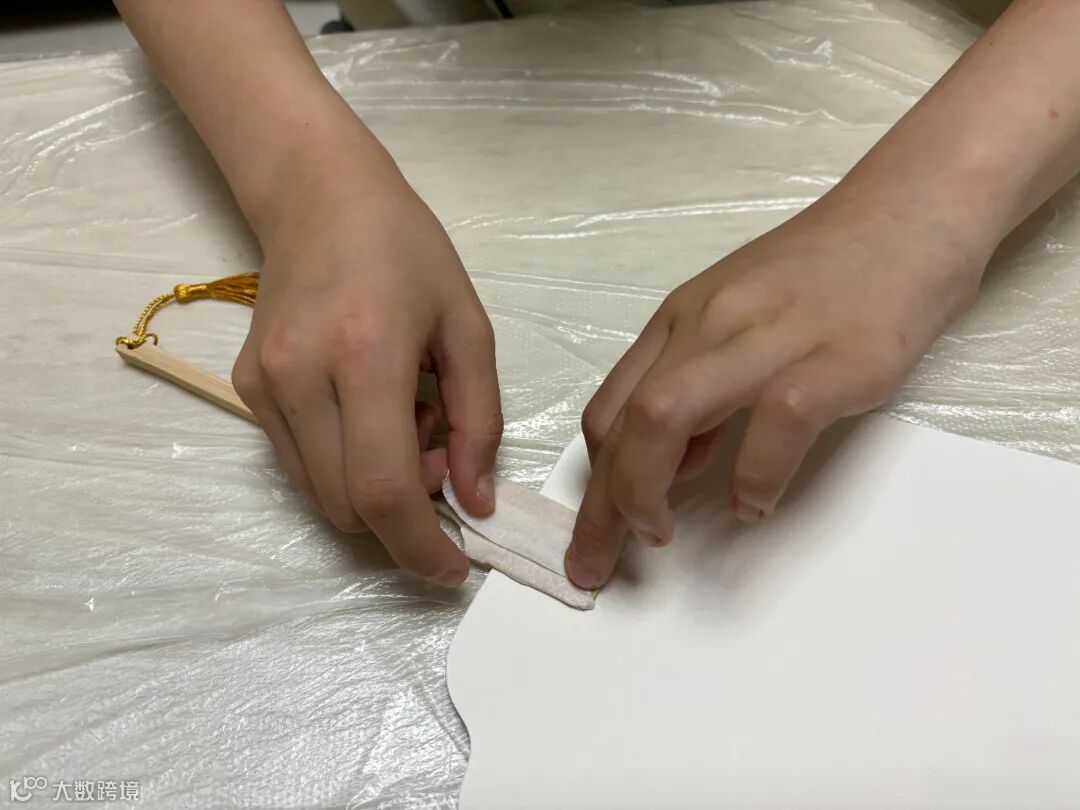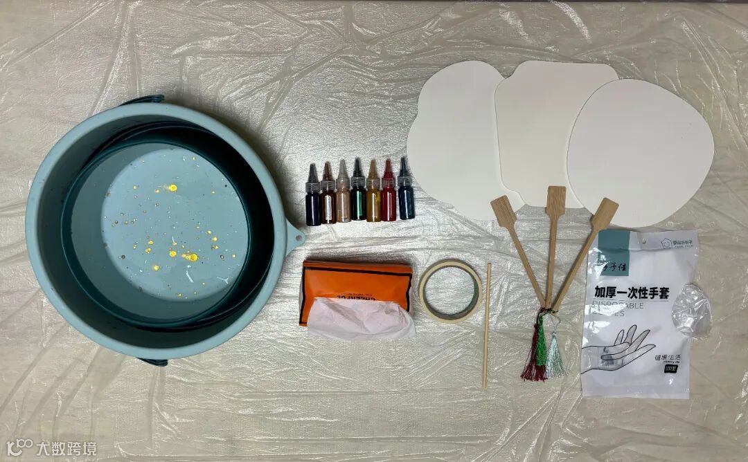 材料准备:空白团扇、天然大漆、橘子油、一次性手套、一次性筷子、美纹纸、水桶、吸水纸。