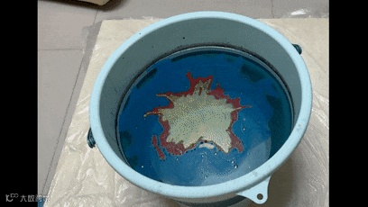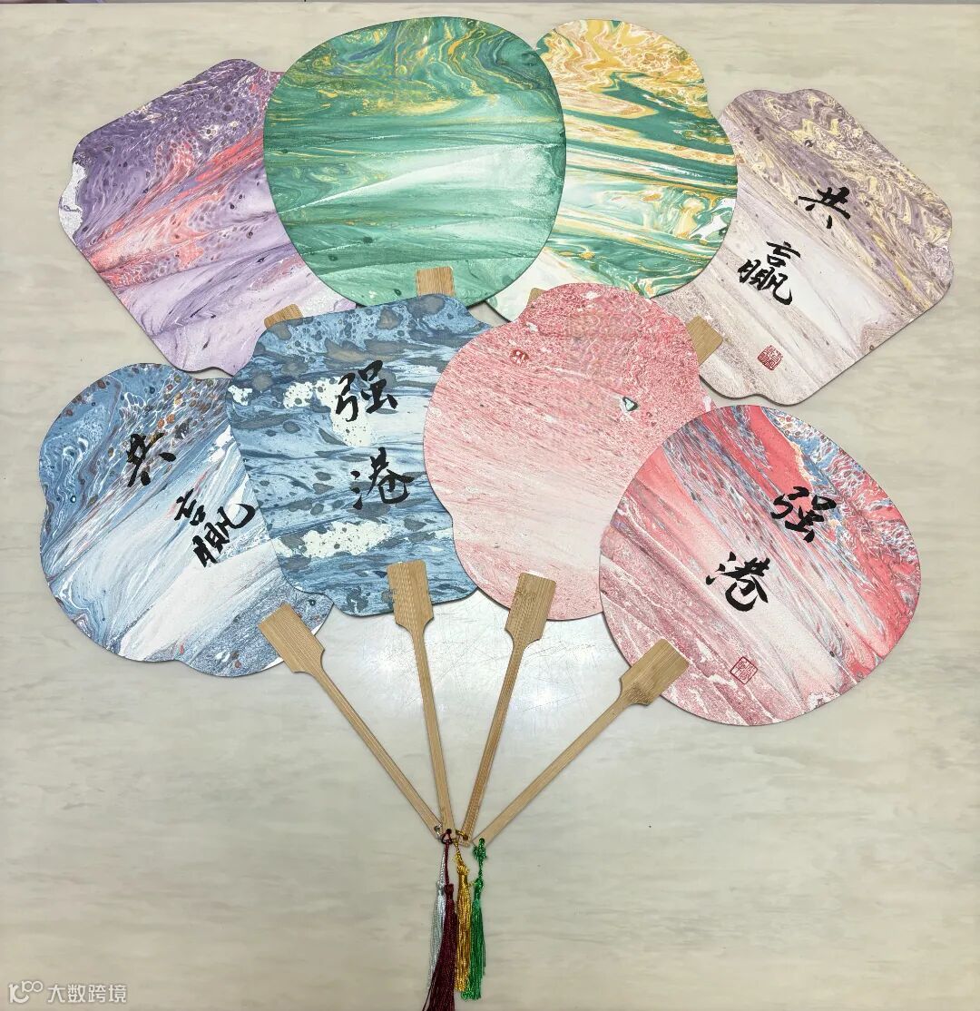 将扇子缓缓浸入水中,通过晃动提转,使水面的图案附着在扇面上,水波荡漾间,扇面呈现出斑斓图案,似星辰,似飞天,似江海山川......