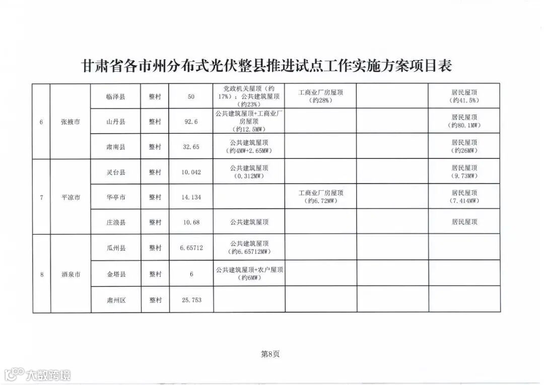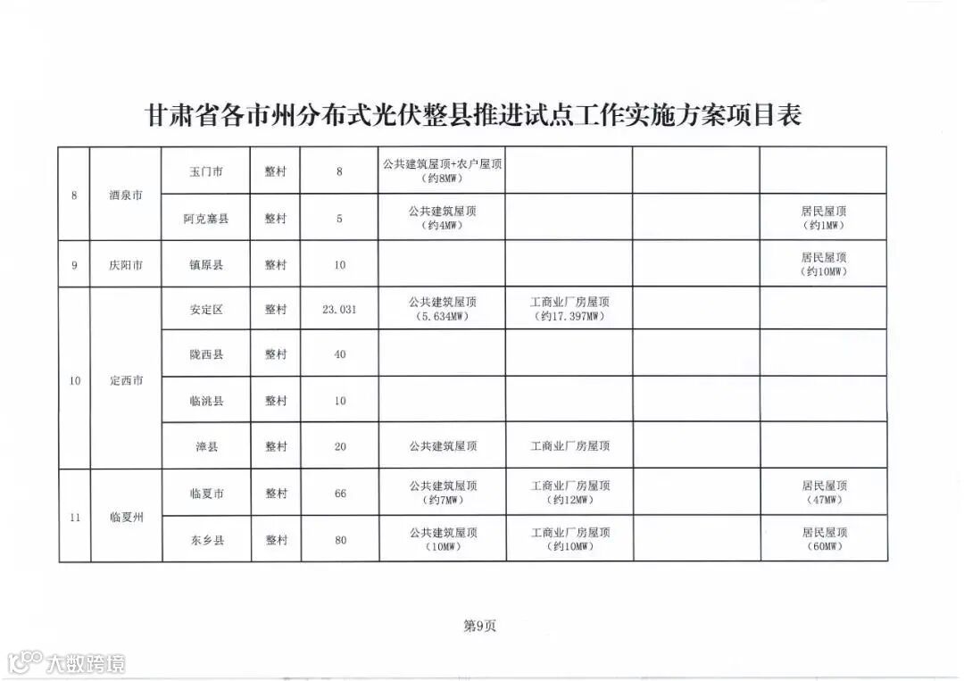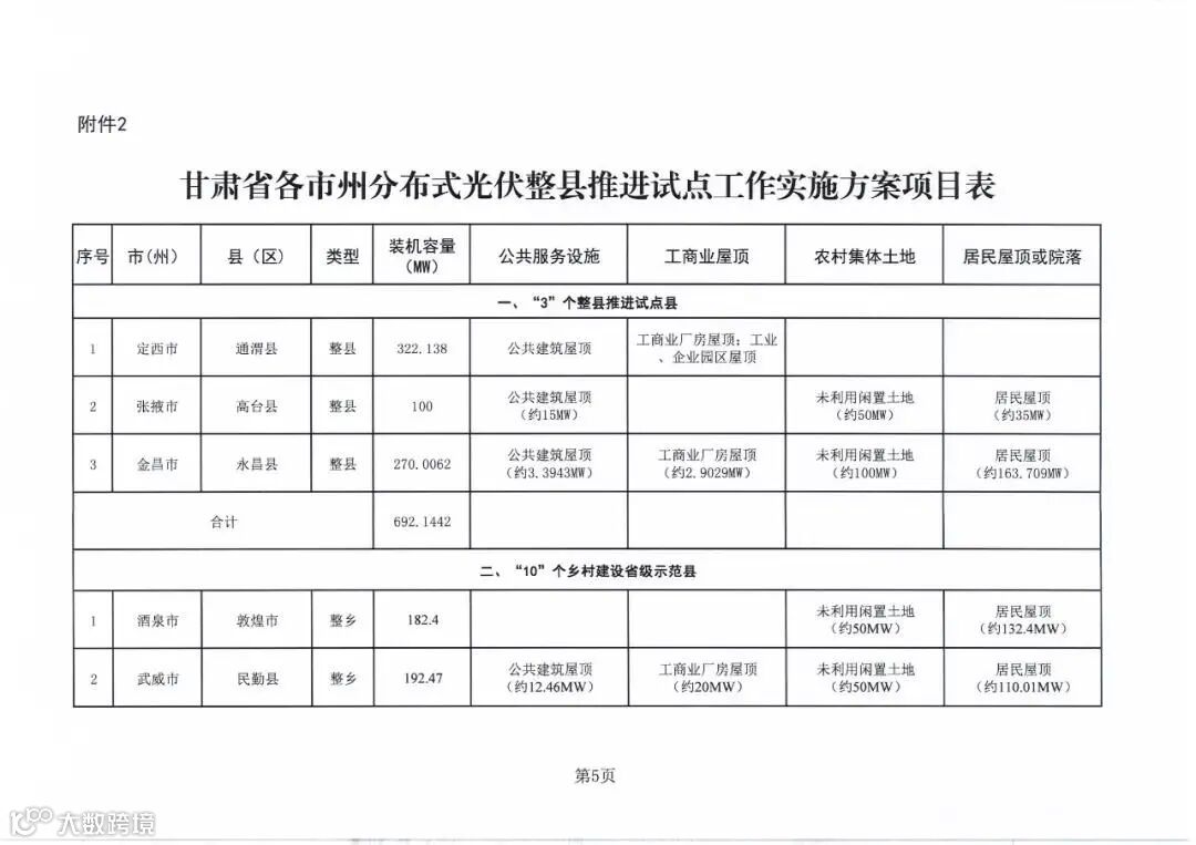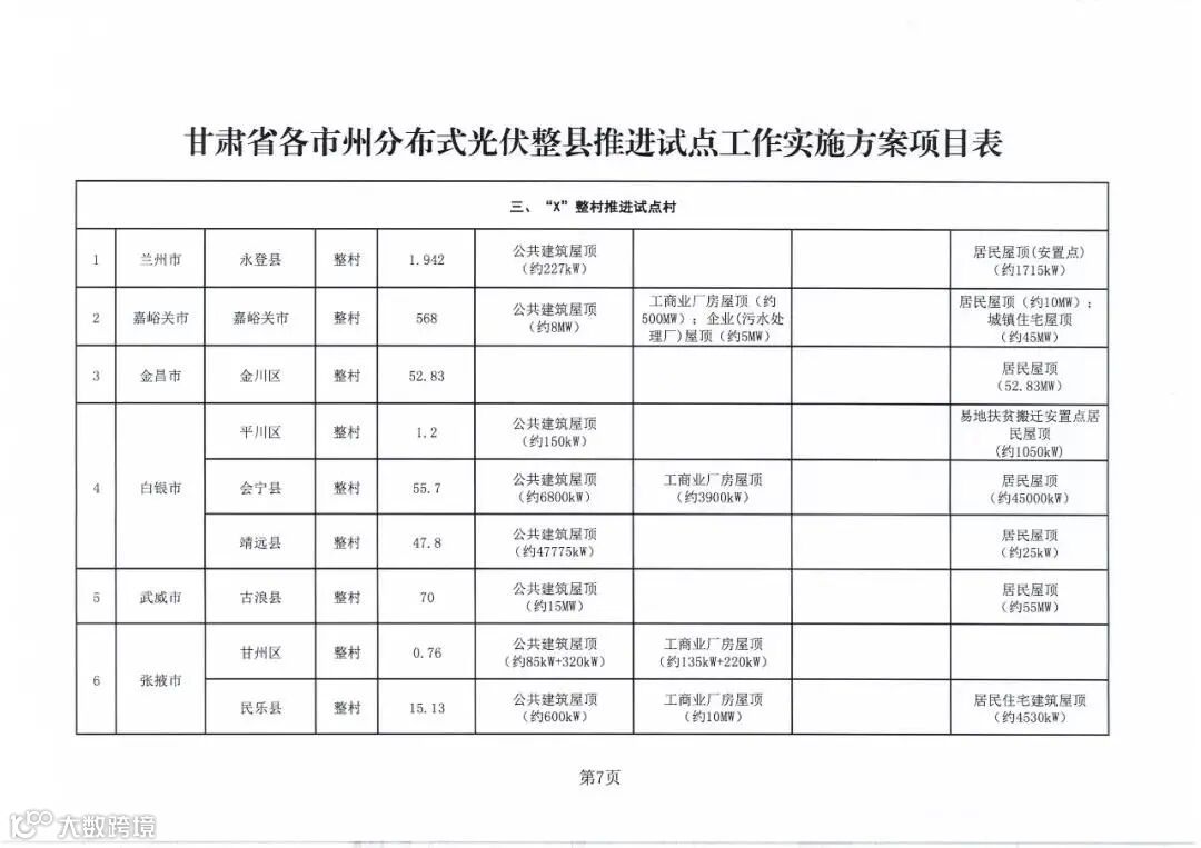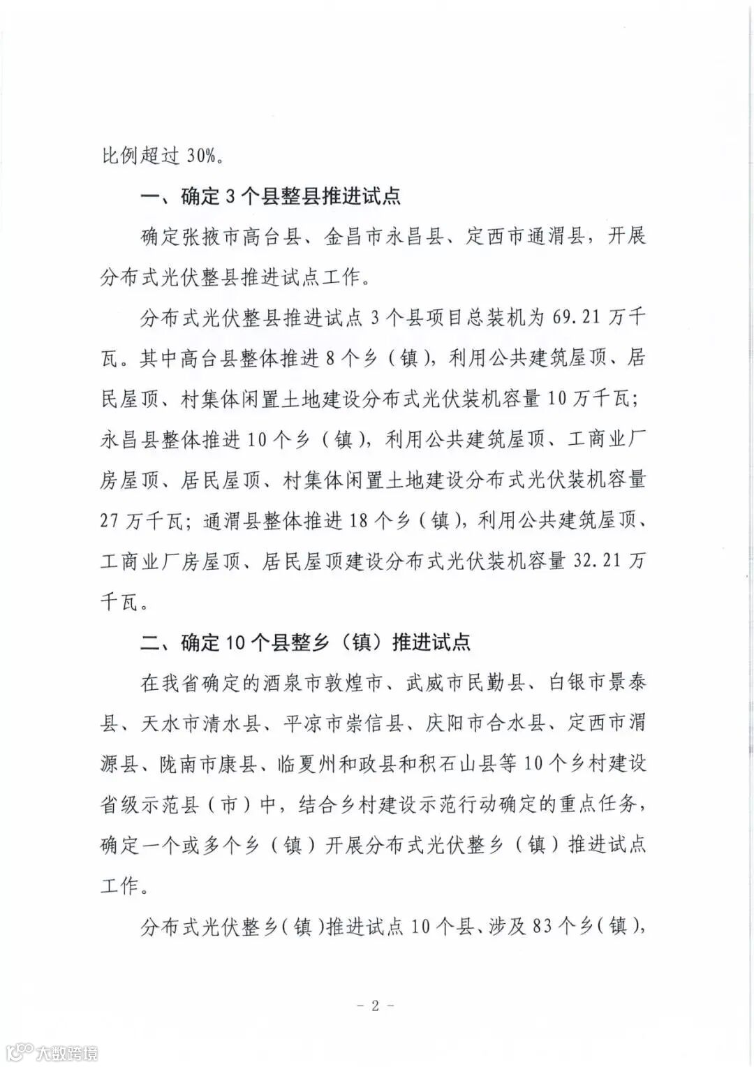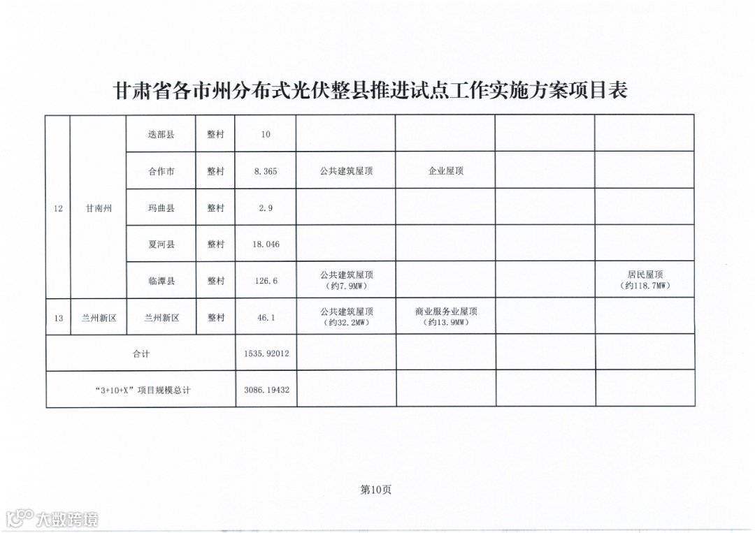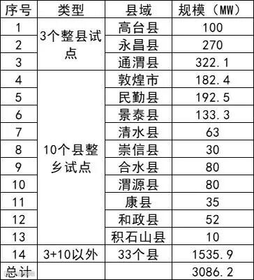 “3+10+X”主要指高台县、永昌县、通渭县3个试点县,涉及36个乡(镇),规划总装机为692.1MW;“10”即确定10个县整乡推进试点,涉及83个乡(镇),规划装机858.1MW;“X”为“3+10”外的其他市、县,共33个县(区)、涉及797个村,总规模为1.5359GW。