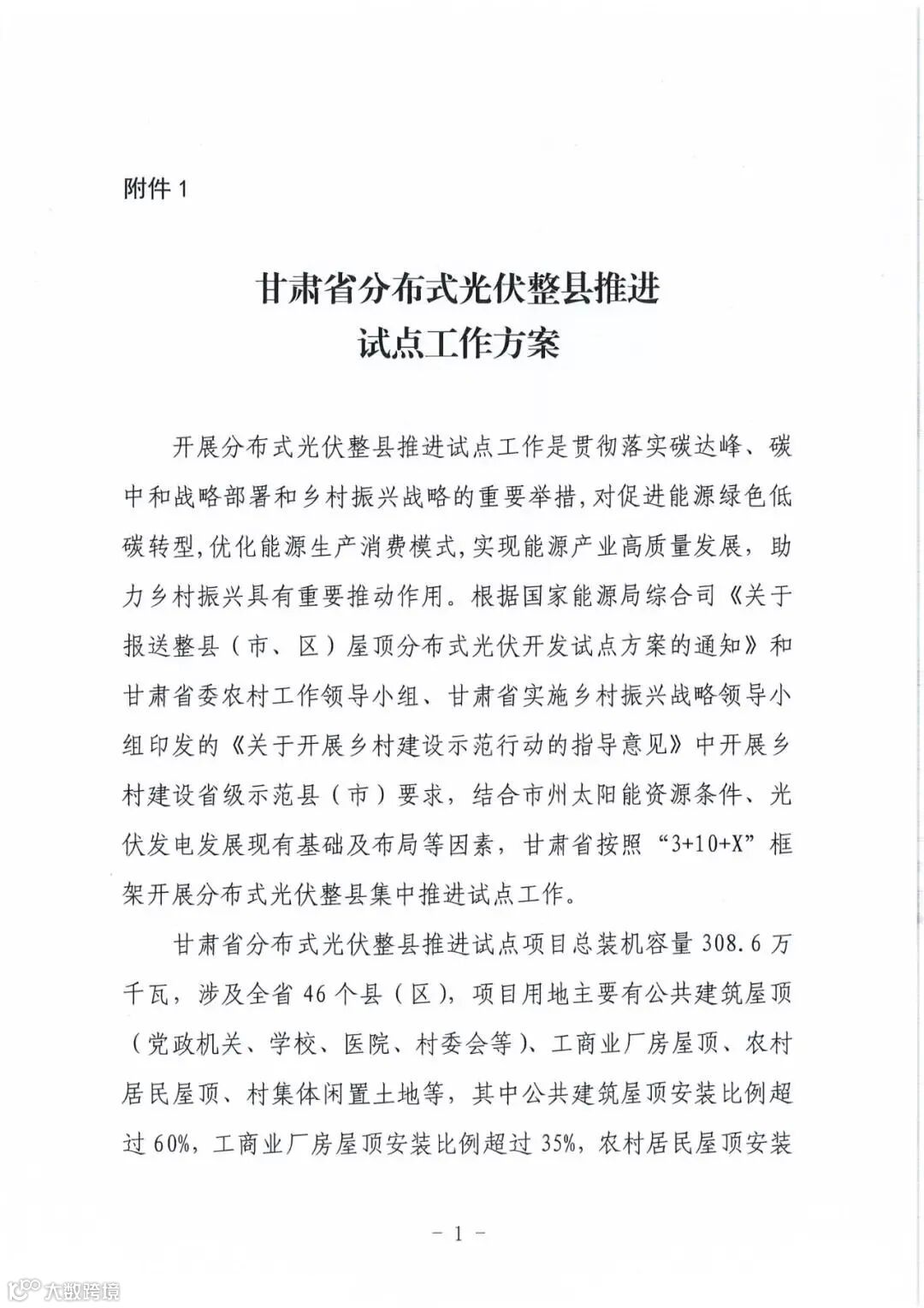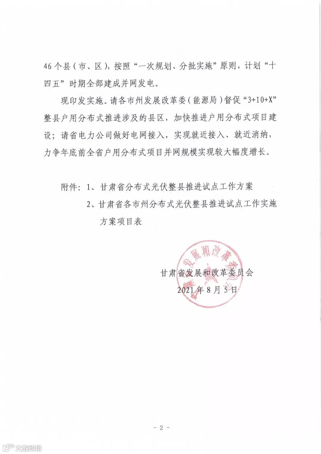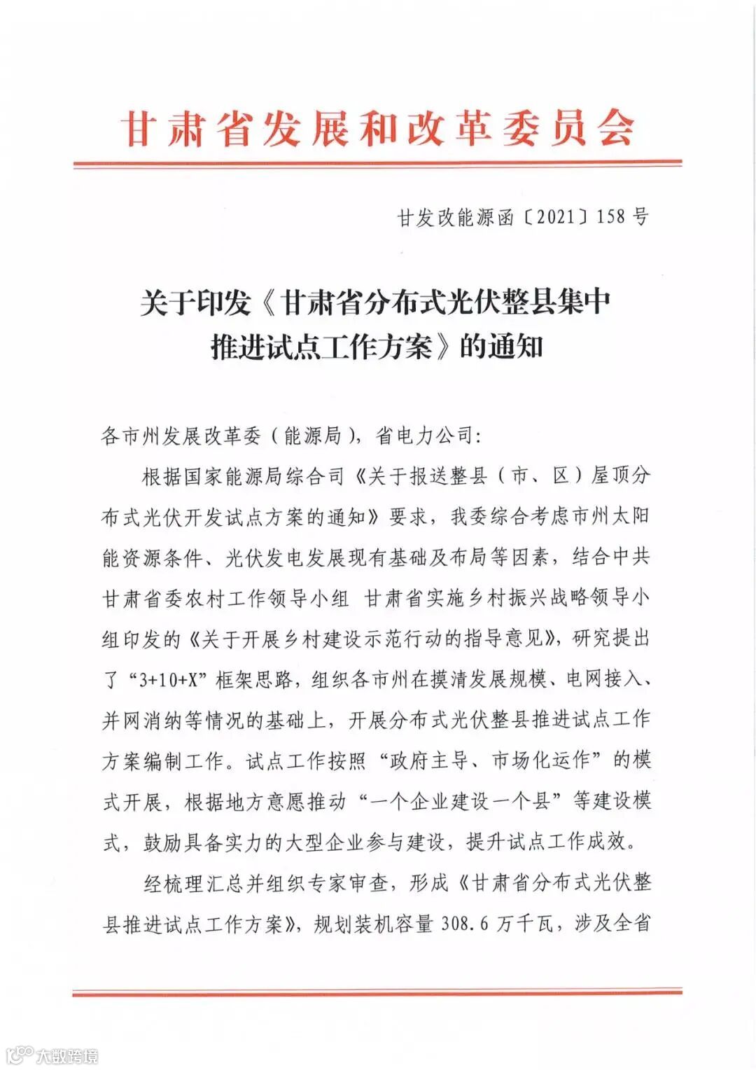 8月5日,甘肃省发改委印发《甘肃省分布式光伏整县集中推进试点工作方案》,按照“3+10+X”框架思路,以“一个企业建设一个县”的建设模式,拟规划装机容量3.086GW,涉及全省46个县,按照“一次规划,分批实施”原则,计划在“十四五”时期全部建成并网发电。