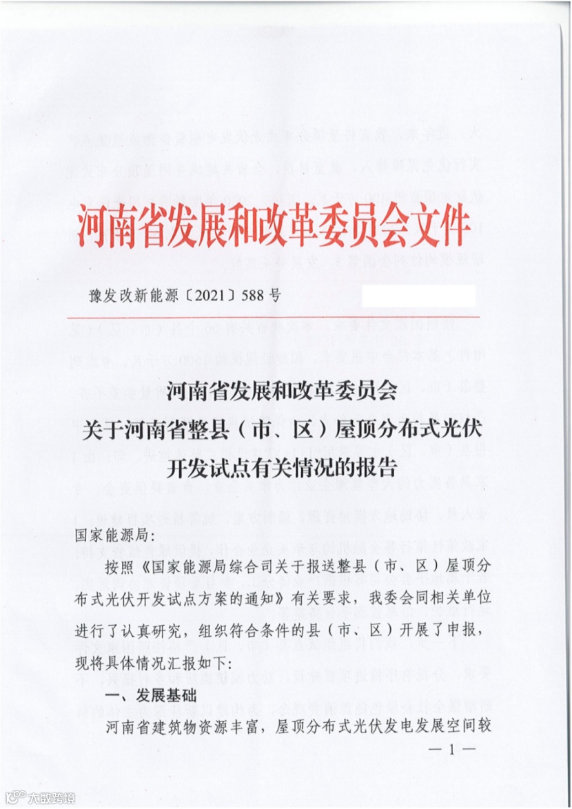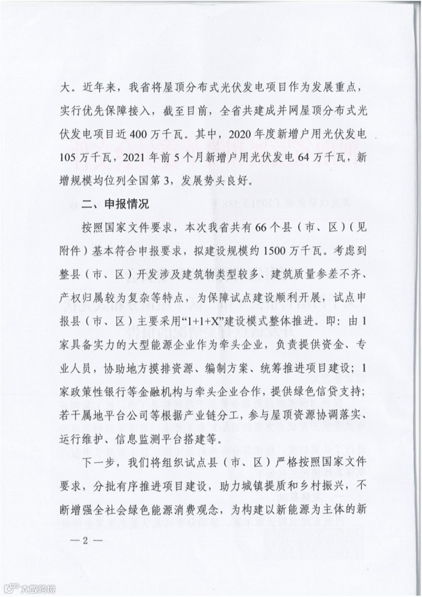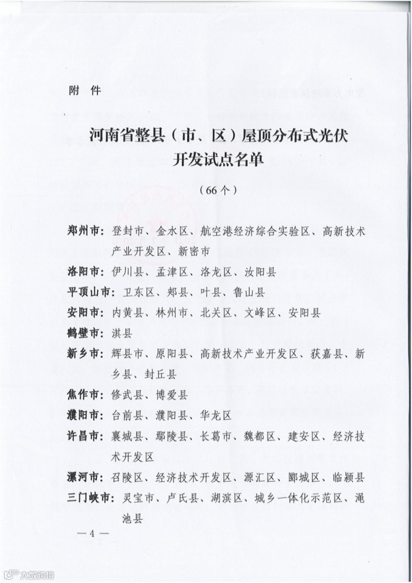 河南省在7月20日印发了《关于河南省整县(市、区)屋顶分布式光伏开发试点有关情况的报告》,明确河南省整县屋顶分布式光伏开发试点名单为66个县(市、区),拟建设规模为1500万千瓦。