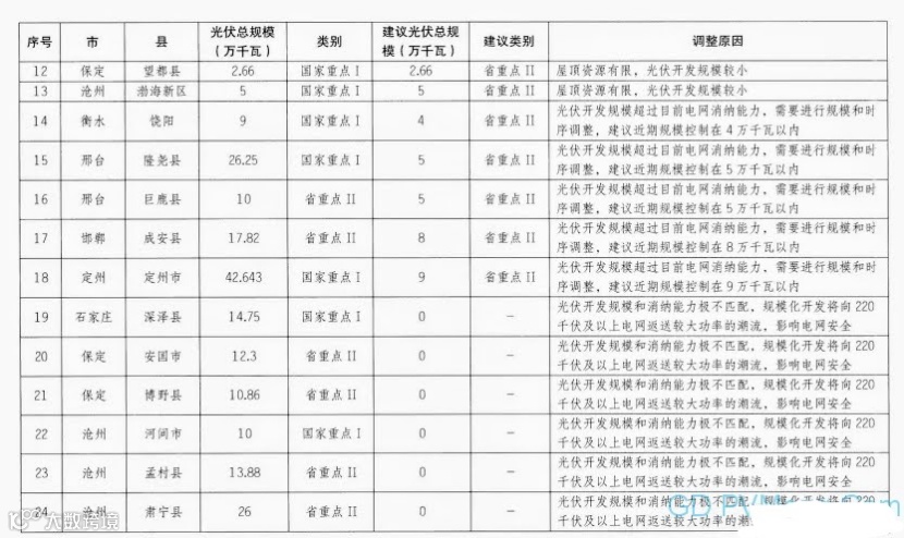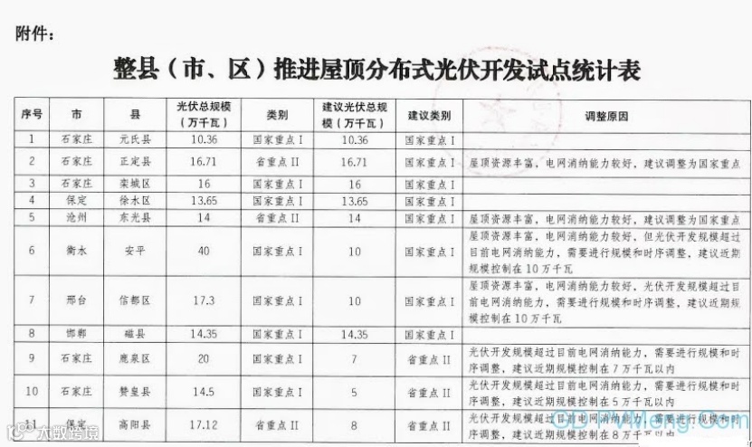 石家庄鹿泉区、赞皇县、保定高阳县、望都县、沧州渤海新区、衡水饶阳县、邢台隆尧县、巨鹿县、邯郸成安县和定州市等10个区县屋顶开发规模控制在100MW以下,推荐为省级试点县。