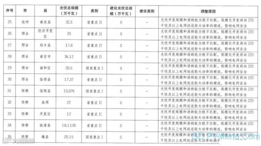 河北省则是国家电网河北电力公司公开了一部分冀南电网辖区内的整县推进试点名单,共上报35个县市区,规模总计为6.22GW;但由于受消纳限制与电网安全影响,共批复18个县市区,规模为1.64GW。