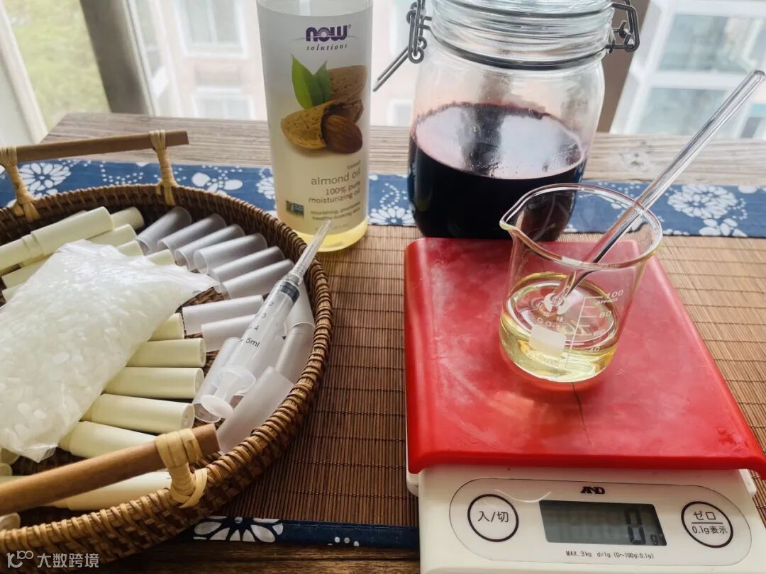 小贴士:大家要注意提前将量杯、搅拌杯、唇膏管,用75%的酒精浸泡30分钟后放入消毒柜烘干哦。