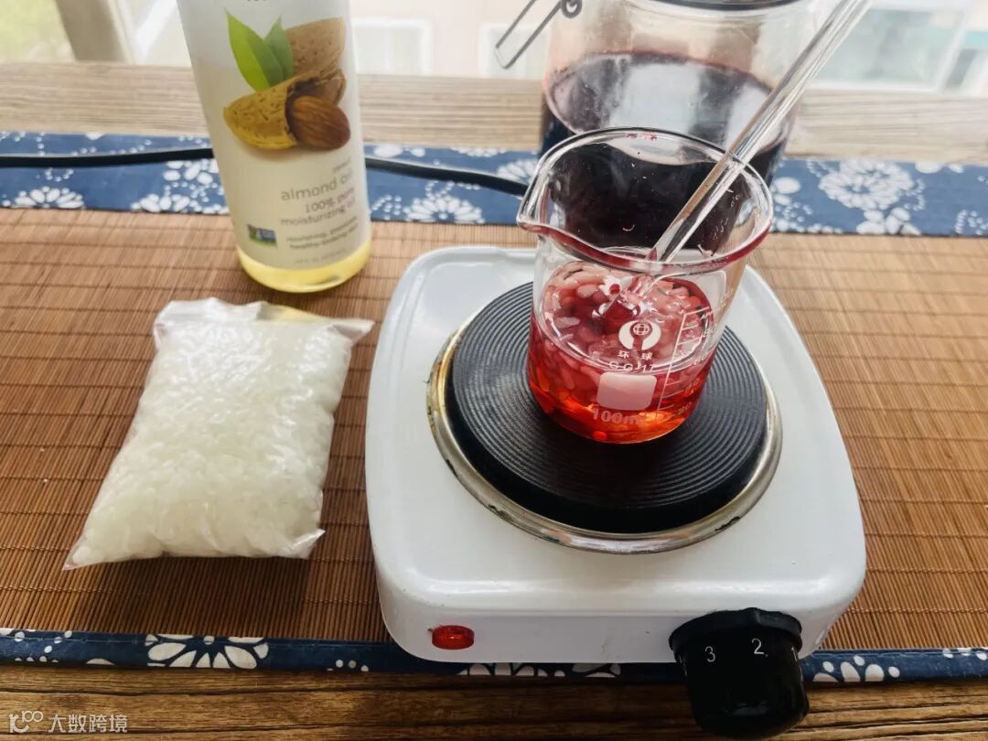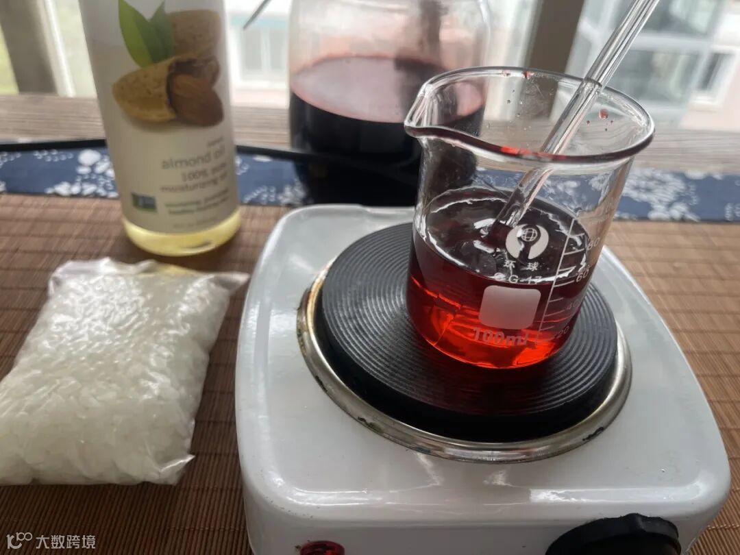将量杯放置于加热器上加热至白蜂蜡融化(温度70℃左右)。
