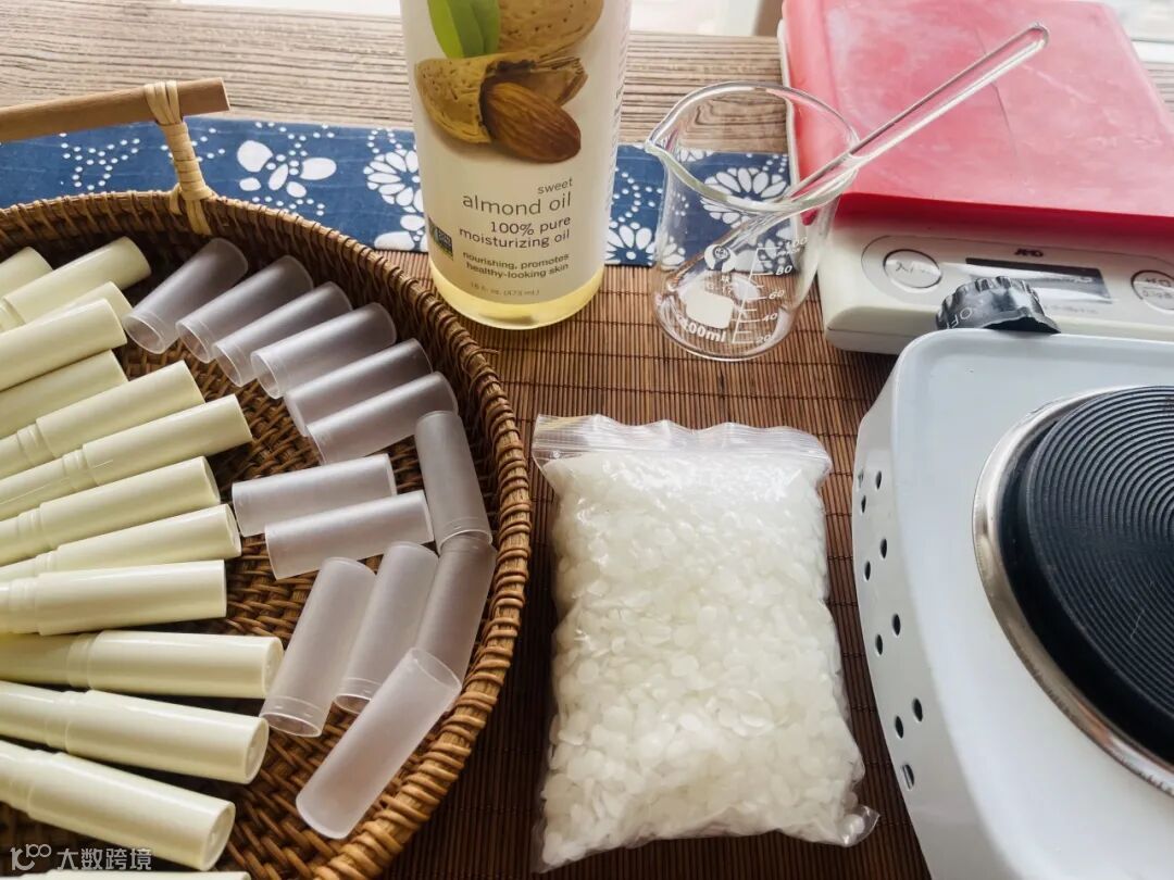 甜仁油40g、白蜂蜡10g、加热器、秤、量杯、搅拌杯、唇膏管。