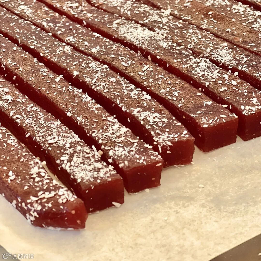 将熬好的“草莓糖浆”倒在油纸上,静待冷却。可根据自己喜好,撒上一点椰蓉哦~