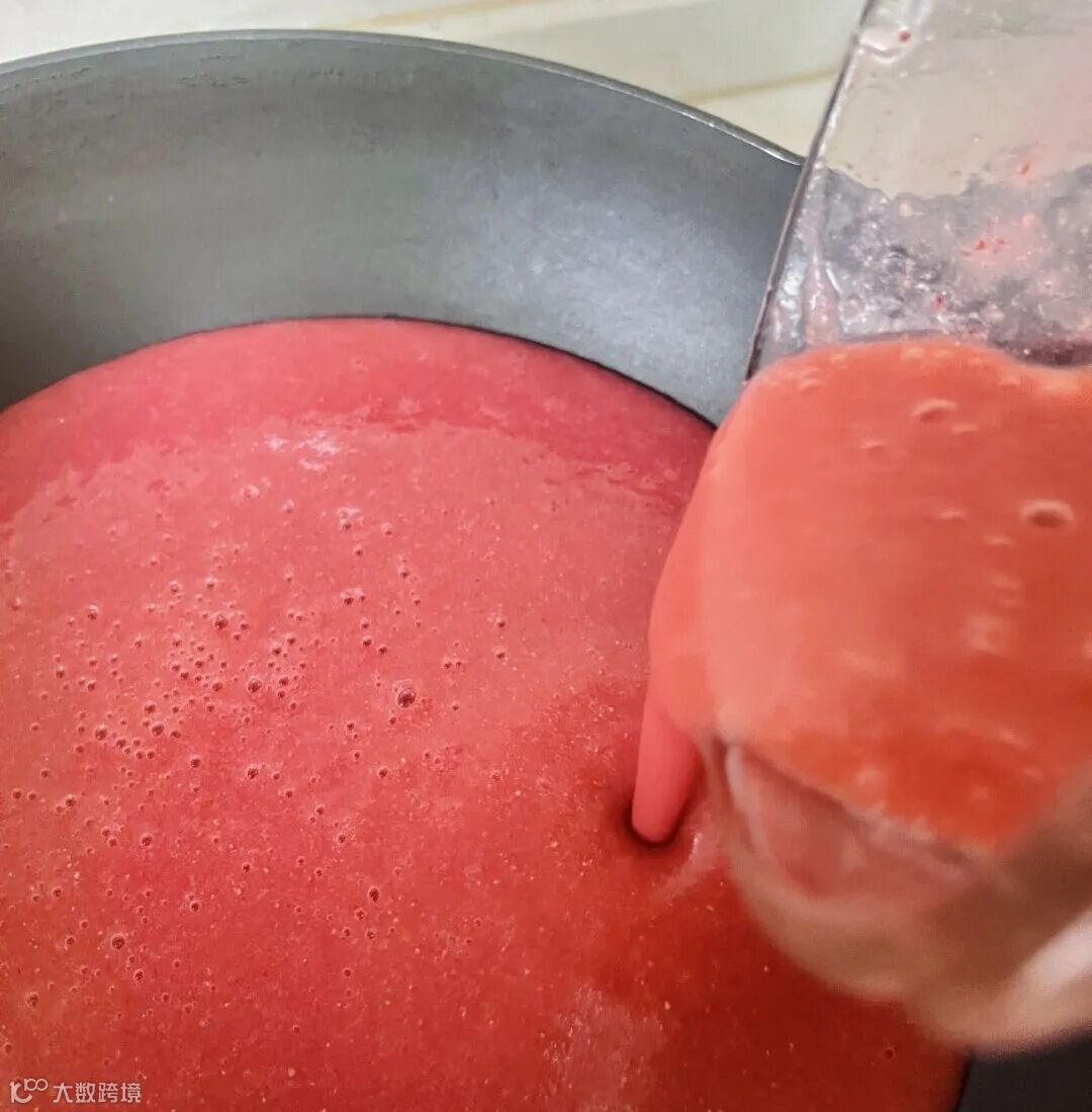 草莓洗净,用榨汁机等设备做成果汁备用。