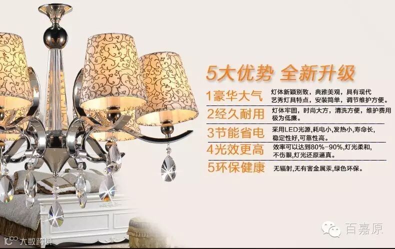 简欧式水晶吊灯风格百搭,头数分别有 3头、5头、6头、8头、8+4/10+5头,适用于客厅、餐厅、卧室、酒店工程等,适用范围广泛。