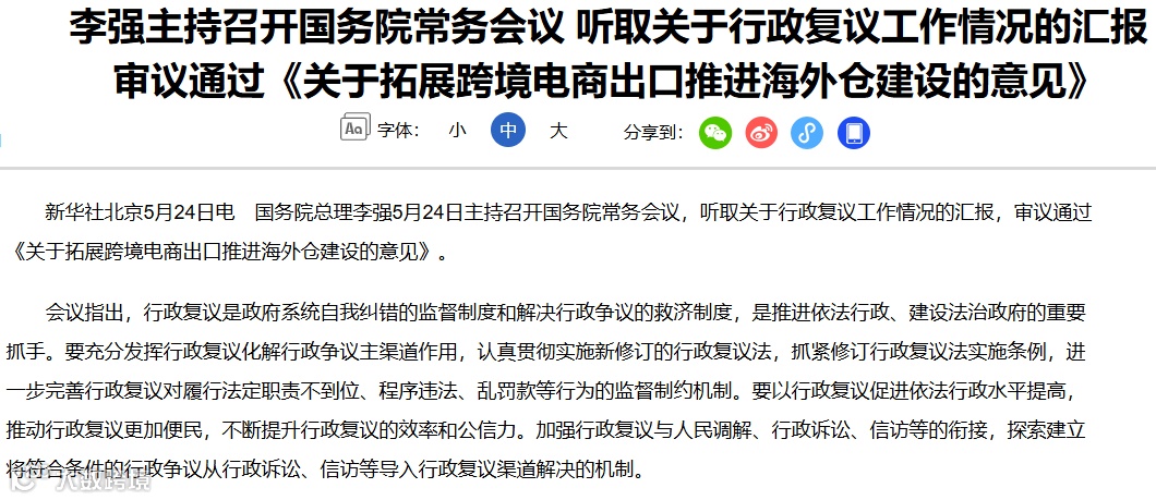 据新华社消息,国务院总理李强5月24日主持召开国务院常务会议,听取关于行政复议工作情况的汇报,审议通过《关于拓展跨境电商出口推进海外仓建设的意见》。