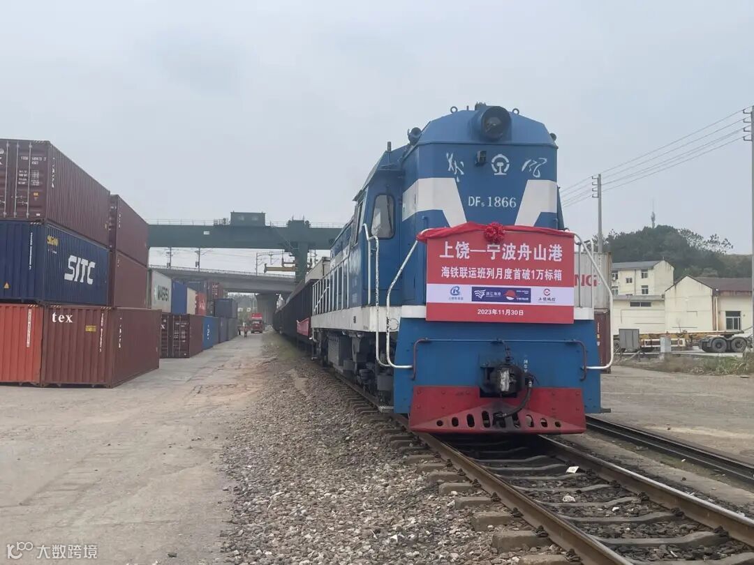 随着一列由上饶方向驶来的列车满载着106标准箱货物,抵达宁波舟山港铁路北仑港站,“上饶—宁波舟山港”海铁联运班列今年11月业务量首次突破10000标准箱,创下单月历史新高。这是宁波舟山港海铁联运团队积极服务构建陆海物流大通道,提质增量保障江西外贸企业出口物流需求的新成果。