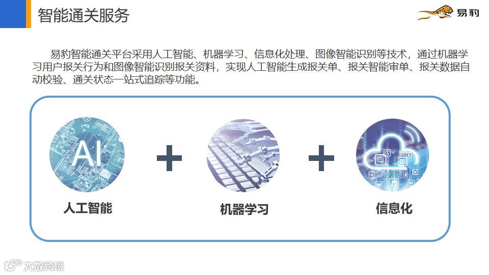 易豹报关系统里的AI智能识别功能,采用的是人工智能、机器学习、信息化处理、图像智能识别等技术,通过机器学习用户报关行为和图像智能识别报关资料,实现了人工智能输单,智能自动生成报关单、人工+报关智能审单、报关数据自动校验、通关状态一站式追踪等等功能。