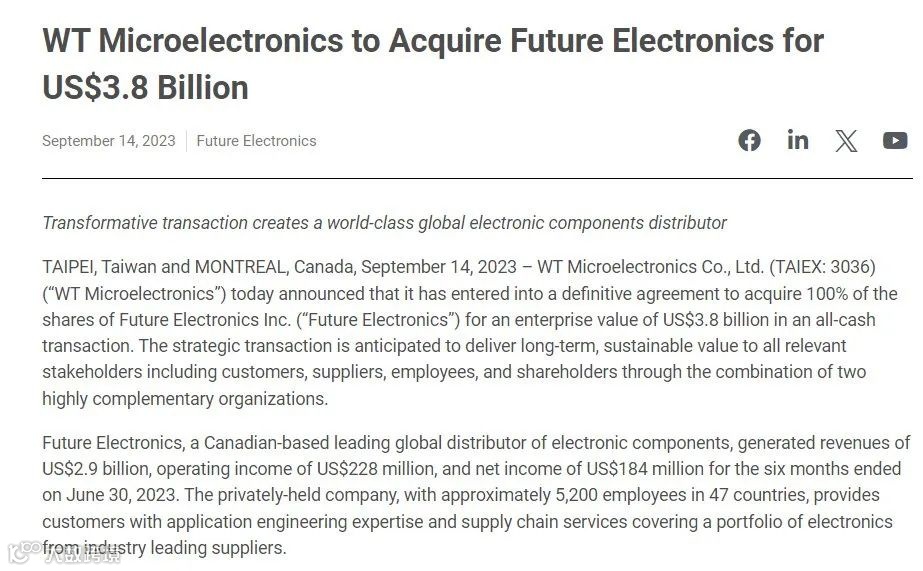 今日(9月14日),文晔微电子股份有限公司宣布已签署最终协议,收购 Future Electronics Inc.(“富昌电子”)100% 股份,全现金交易企业价值为 38 亿美元。