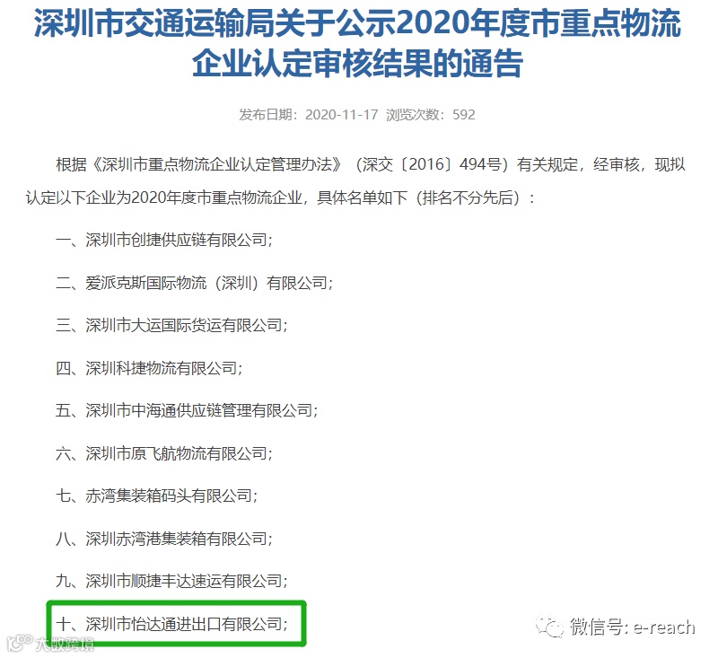2020年11月30日,深圳市怡达通进出口有限公司(以下简称:公司)荣获“2020年度深圳市重点物流企业”荣誉称号,此次评选结果代表了深圳市交通运输局对公司在物流服务、安全、效率等方面的肯定。