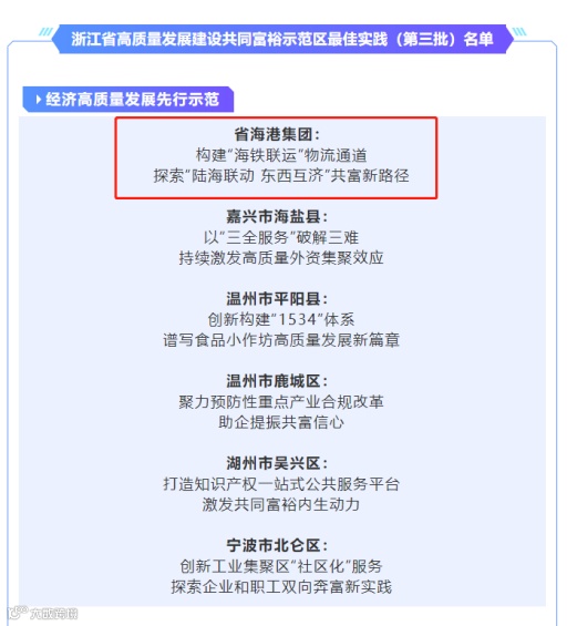 近日,浙江省高质量发展建设共同富裕示范区最佳实践(第三批)名单公布。在51个入选案例中,由浙江省国资委推荐,并会同浙江省海港集团、宁波舟山港集团申报的《构建“海铁联运”物流通道 探索“陆海联动 东西互济”共富新路径》成功入选,成为经济高质量发展先行示范项目。