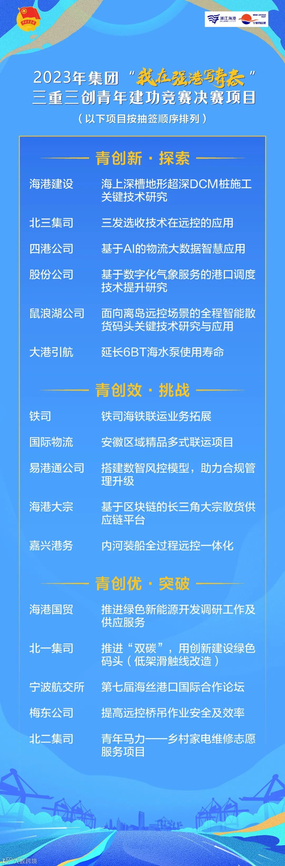 前期,经过各公司择优推荐、集团团委预评、集团相关部室联合评审,共有16个优秀项目入围此次决赛。决赛项目分为青创新·探索、青创效·挑战、青创优·突破三大篇章,涉及科技创新攻关、生产进度、业务拓展、工程建设、社会责任等多方面,让我们共同期待决赛现场的青春火花!