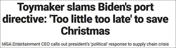 全球最大私营玩具企业MGA Entertainment的CEO艾萨克·拉里安(Issac Larian)14日甚至向福克斯新闻旗下“美国新闻室”节目抱怨称,今年美国圣诞季的生意已经很难挽回,因为“你没法找到劳动的人手,也没法找来卡车,这样就没法把商品送出去”。