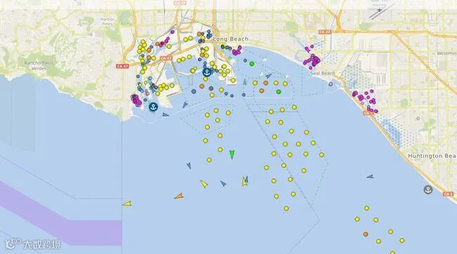 北京时间26日9时,洛杉矶港和长滩港外的船只排队情况 图自航运数据网站Vessel Finder