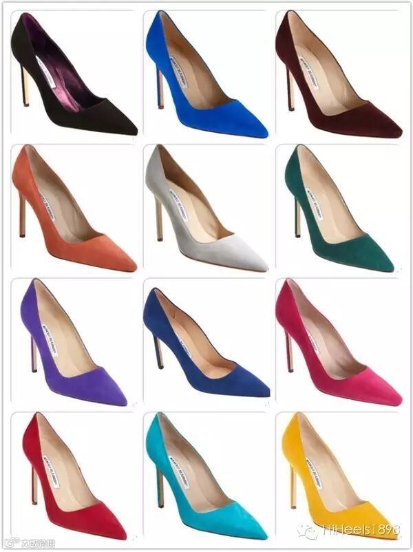 Manolo Blahnik家经典的的Suede BB Pumps系列也是主打尖头鞋,但和Jimmy Choo不同的是,专攻颜色鲜艳的麂皮,也就是山羊皮。