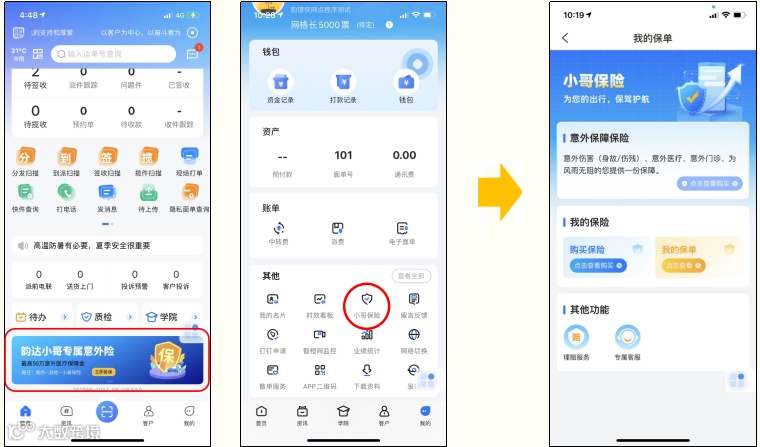 购买路径:进入快递员揽派系统(韵镖侠)—我的—小哥保险—购买保险(点击查看保险详情)