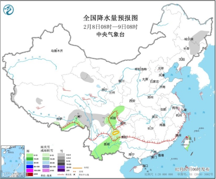 2月9日08时至10日08时,新疆、西藏北部和东部、青海北部、甘肃河西、川西高原中部、云南西北部等地的部分地区有小到中雪或雨夹雪。青海东部部分地区有5~6级阵风。