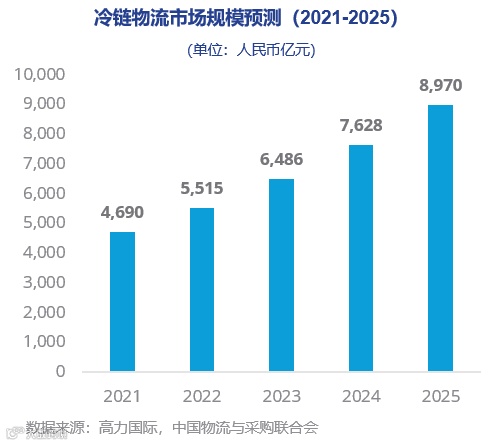 中国冷链物流市场规模2020年达到3,832亿元,复合年均增速18%,预计未来五年会继续保持较高增长态势。