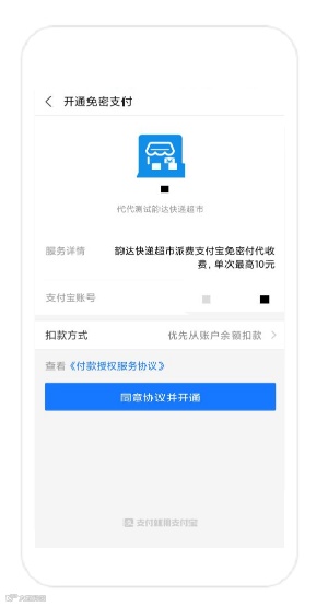 此页面中可以进行免密授权;必须授权免密支付,门店才可在入库时扣取派费,正常使用派费结算功能;单击后弹出支付宝授权页面。只有处于合作中的状态且开通免密代扣,入库时才可正常扣费。