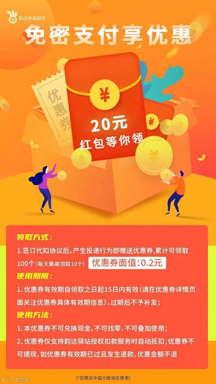 二次入库时支付宝系统自动抵扣(优惠劵仅支持韵达快递超市门店授权扣款服务)。