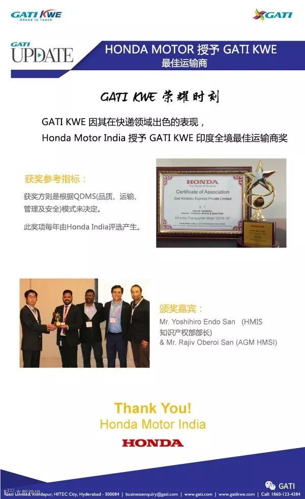 导读:HONDA INDIA 授予 GATI KWE 印度全境最佳运输商