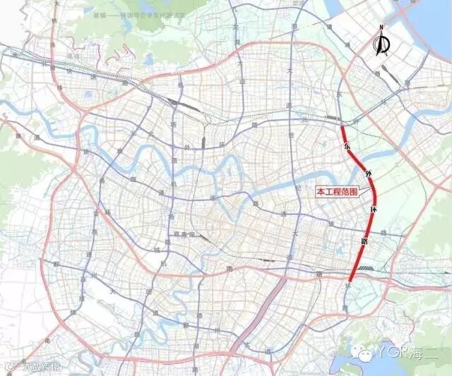 东外环路快速化改造工程覆盖镇海区、北仑区、高新区、东部新城、鄞州区。北起北环东路钟包立交,南至北斗路,全长约13.6km。
