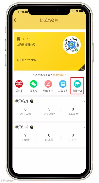 业务员可在韵镖侠APP中,点击 [我的名片分享] - [快递员名片] - [我要开店],进行自主注册。