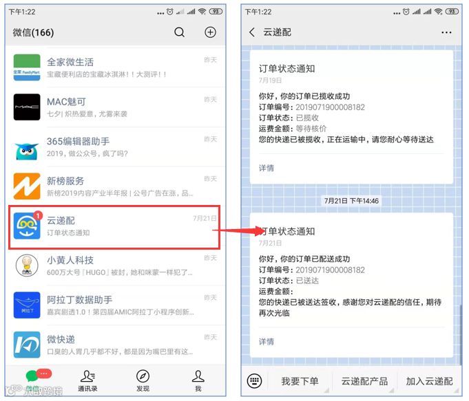 通过快递小哥“我的名片分享”下单,下单客户关注云递配公众号可及时获取订单详情和物流信息,各位小哥在分享名片的同时,可将云递配给公众号二维码分享给客户,客户自行关注物流动态,让小哥们更省心。