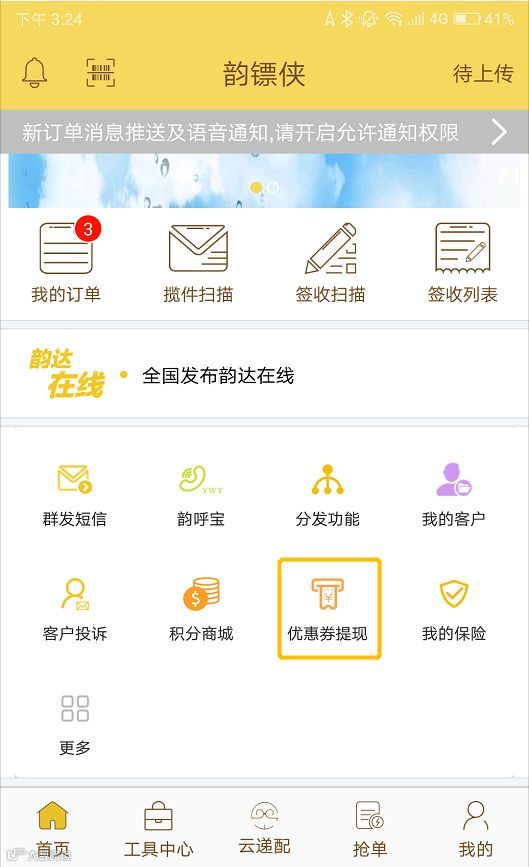 第一,进入韵镖侠APP,打开“优惠券提现”功能