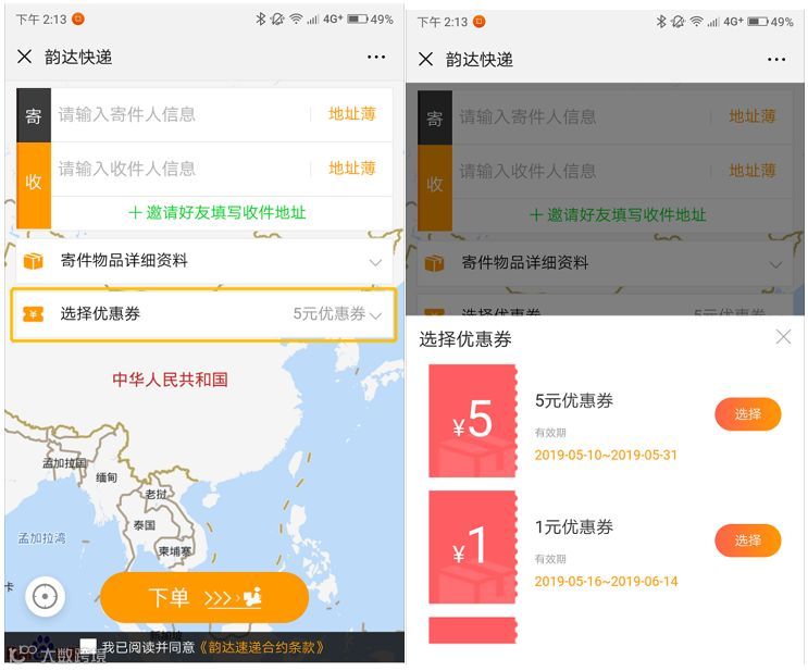 已经获得韵达快递费抵用券的用户,可通过微信公众号或支付宝生活号登录韵达会员平台,打开卡包选择快递费抵用券下单使用,或是直接在下单页面选择快递费抵用券使用;