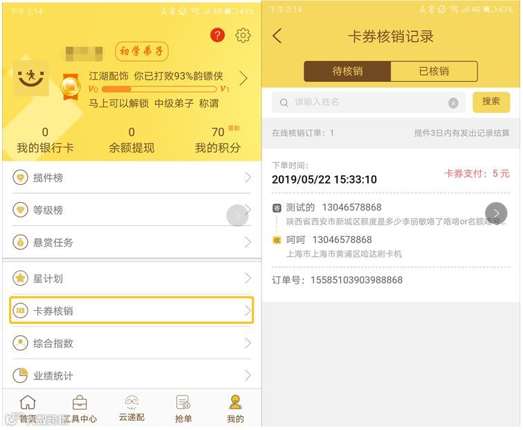 也可在卡券核销功能中查看使用快递费抵用券的订单,操作如下: