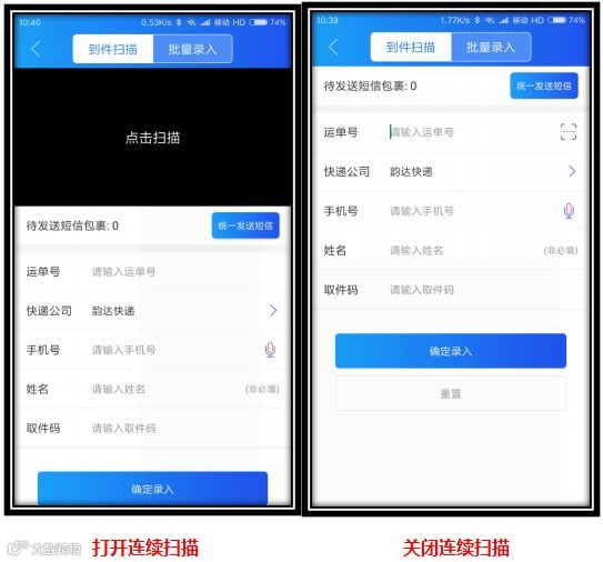 单票录入:可以一票一票扫描入库发短信 (注:目前每天可获取100个菜鸟订单的手机号)