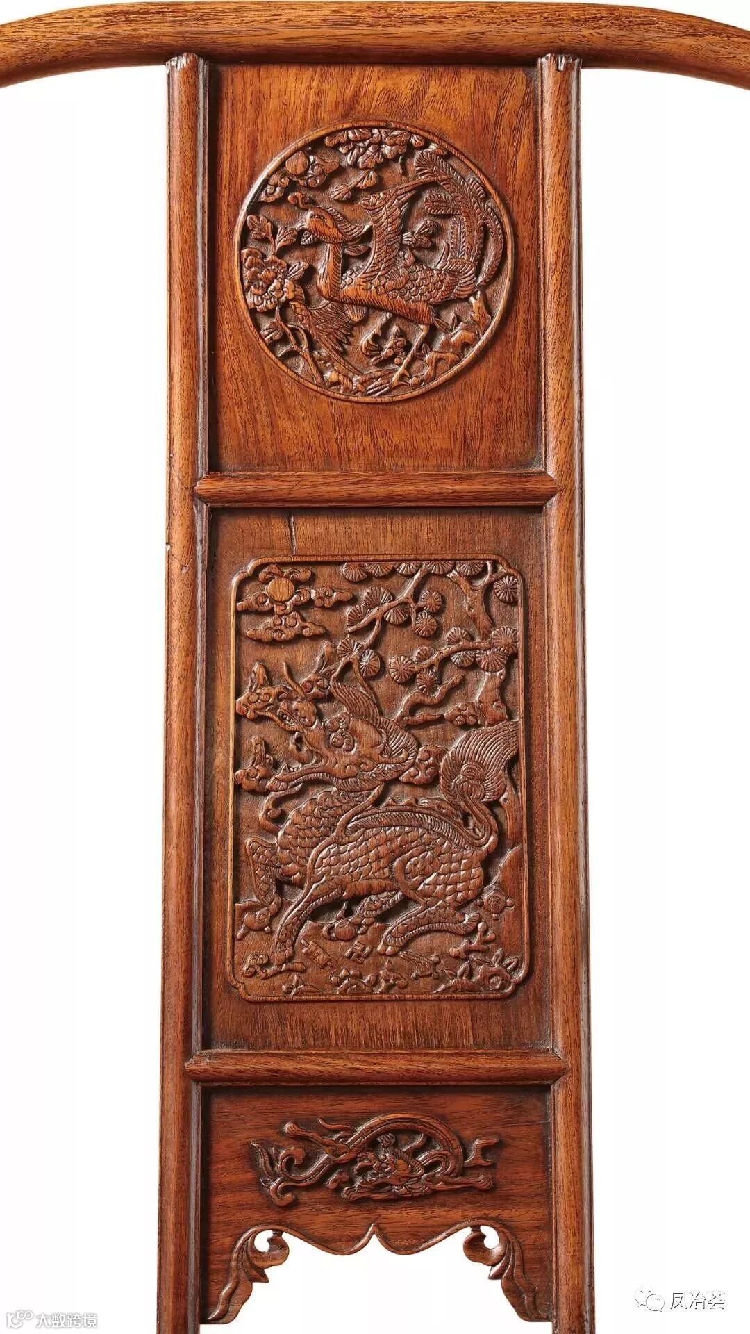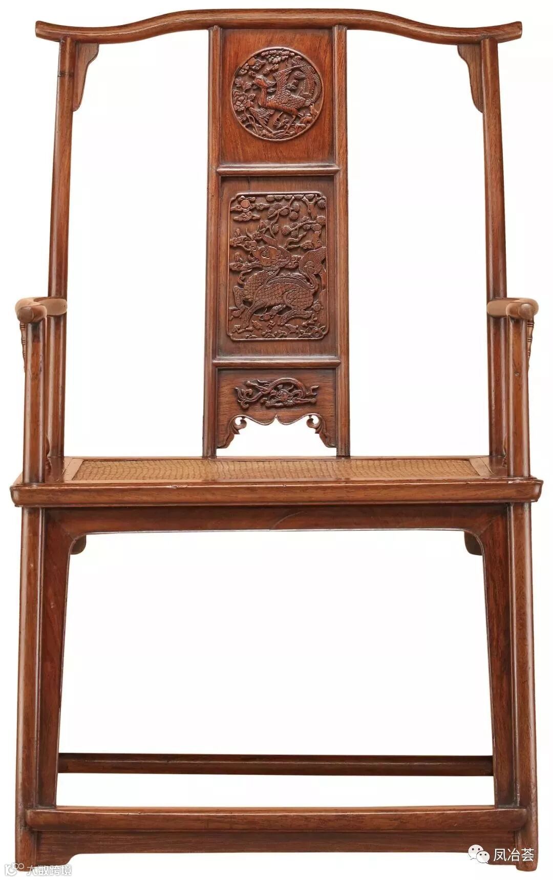 搭脑柔和起伏,与后腿间装有小角牙,既有装饰效果,又有结构作用。靠背板甚为精彩,三攒式,上方圆光,下方长方委角开光,恰和古人天圆地方之哲学概念。圆光内浮雕丹凤朝阳纹,杂以牡丹装饰。长方委角开光内饰麒麟纹,麒麟龙首,须发凝为一束前冲,圆睛,两喙大张,触角飘动,尚有万历时期龙纹特征,说明此椅制作时间离此不会太远。身披鳞甲,腿足根部有火焰翼,麈尾高扬,前腿一足提起,一足直立,后腿半曲,作欢腾跳跃状,甚为喜庆。麒麟旁有夭矫古松,远方云朵托着山峦,上方祥云拱日,下方地方散布火珠、如意、犀角、珊瑚等杂宝,一派海晏河清、盛世祥瑞之 象。亮脚牙板甚高,壸门式,两边卷草纹,上则浮雕回首螭龙,若浮空而行,夭矫非凡。