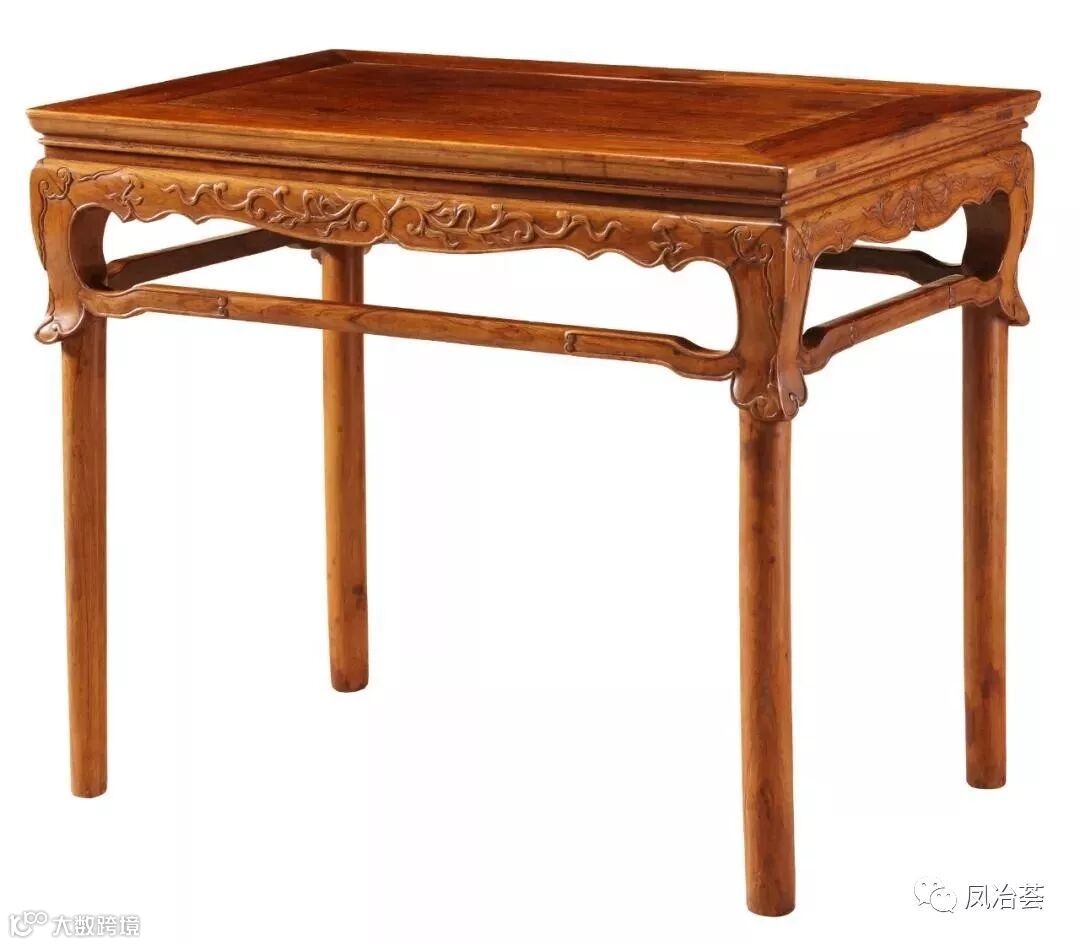 此桌矮而阔,以质朴敦厚见长。桌面边框甚宽,纹路相近,应为同一块大料开出。冰盘沿敛入较多,曲线柔和。较为奇特的是束腰上方做一圈凸棱,使得冰盘沿的压边线也如同收进的矮束腰,形成上下两层束腰的效果。壼门牙板,沿边起柔韧的阳线,在壼门中间处衍化为交缠的捲草纹,草叶舒卷大方,不失粗犷,显示出很强的生命力。牙板两侧有小弧尖,往内则袅出一隻灵芝。肩部雕刻如意云纹披肩花,是从铜饰件装饰衍化而来。牙板与腿足交圈,腿足做成展腿式,两节状,其实为一体雕成。上部三弯式方腿,末端外撇,雕花叶装饰。腿间设罗锅枨相连,罗锅与腿足相交线条柔和,与腿足圆转曲线走势相接。如此一来,牙板、腿足、罗锅枨围合成变体如意形开光。腿足边缘的阳线,在罗锅枨上交圈后延伸尺许,浮雕为卷珠收尾。下方圆腿,木纹甚佳,晕节连连,色泽如蜜。