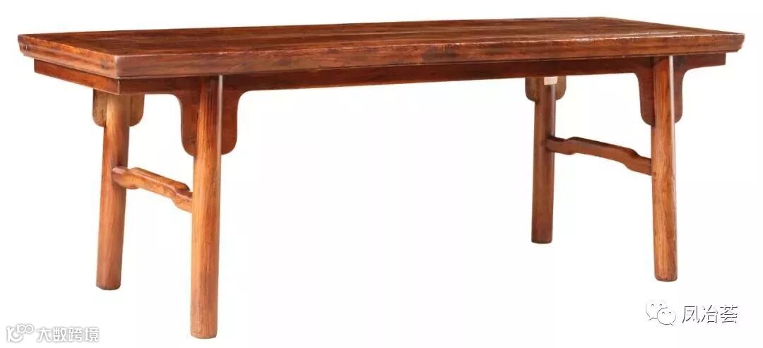 所见这类屉板平头案,腿足与屉板边框(即横枨)的交接方式有两种,一种如本例,圆腿足,抹头(即短边)与腿足相接,里外皆做成飘肩,大边(即长边)内侧与抹头相碰,外侧作飘肩。另一种 则是腿足此处截面变为外圆内方形,大边和抹头皆与内侧与之平接,外侧作飘肩。这两种做法都存在,似乎并无时代、地域之差别,只是不同的匠作习惯罢了。