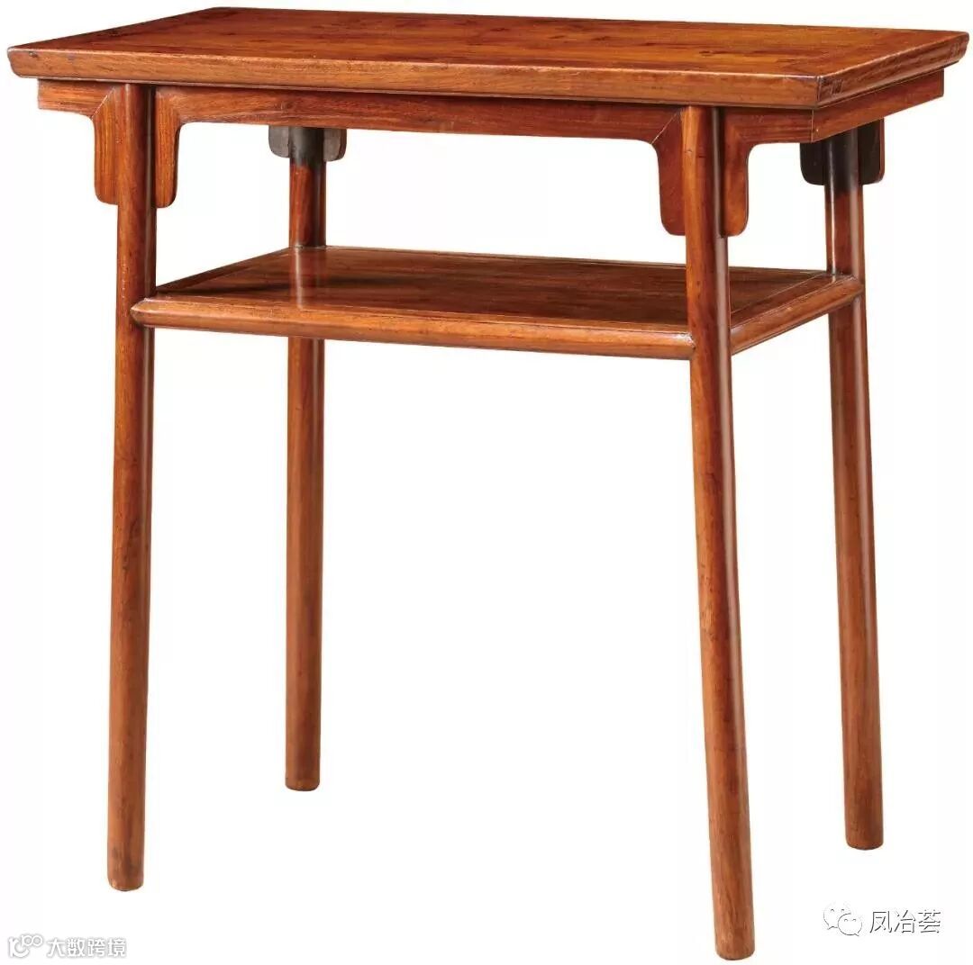 展腿式是一种造型较为特殊的家具,常见于桌、几,顾名思义,即言其形如矮桌内接圆腿加高的效果,腿足上方内缩, 上方展开,故名。至迟元代已经有展腿 式的家具,诸如永乐宫重阳殿南壁东侧《道观斋宫图》中就有所见。就造型而言, 展腿式家具应该是自折迭腿的高低两用家具发展而来。