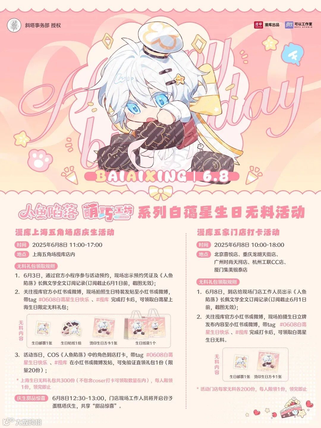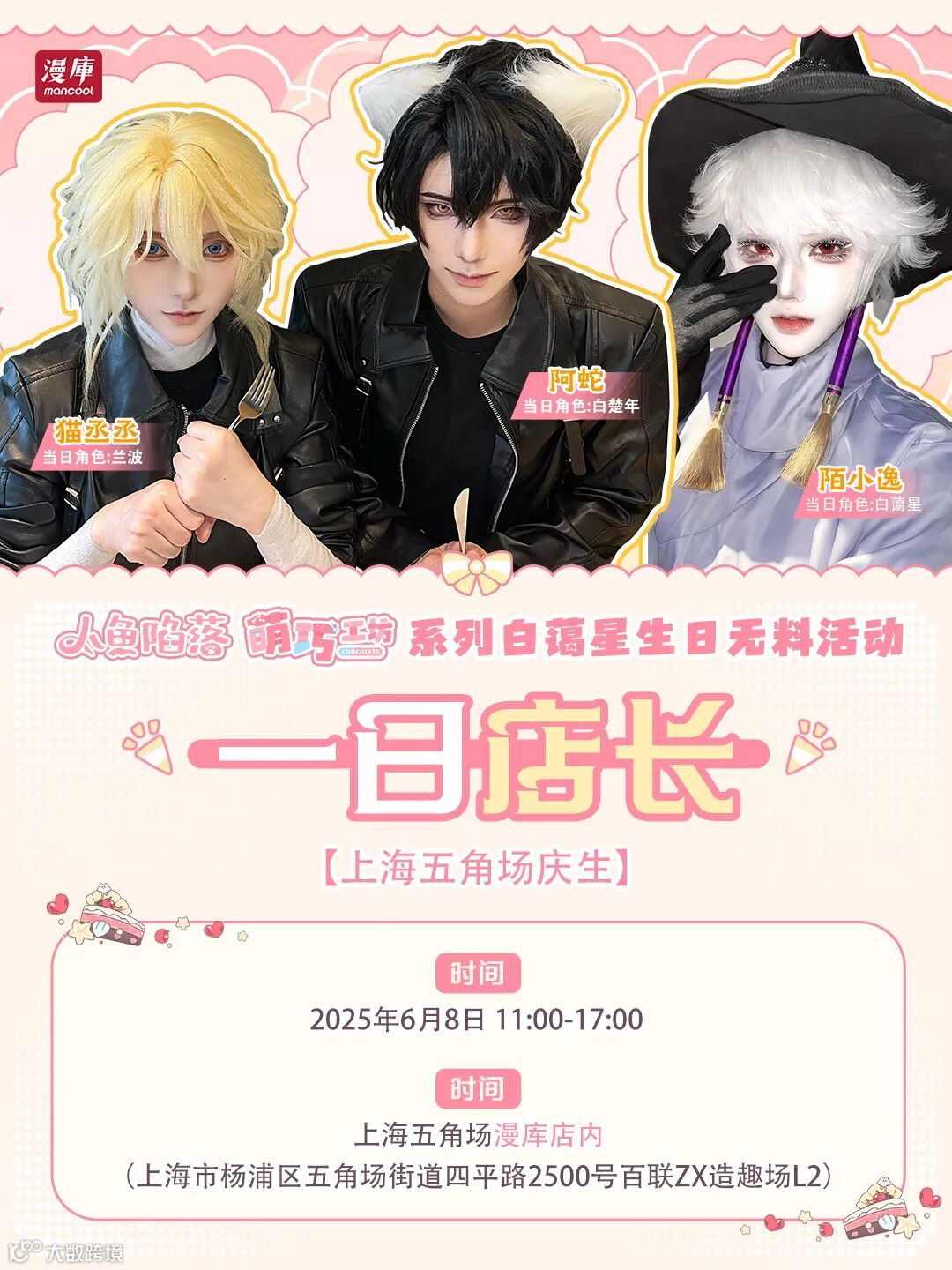 3、活动当日,COS《人鱼陷落》中的角色到店打卡,带tag #0608白蔼星生日快乐##漫库# 发帖,可免验证直领礼包1份(限量20份);