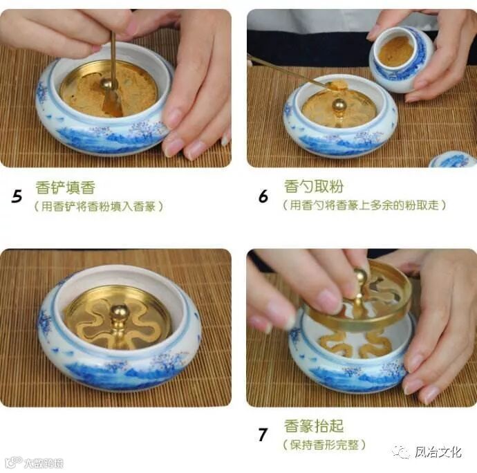 香篆:又称“香篆”、“印香”、“百刻香”,用模具将香粉压制成特定的(“连笔”的)图案或文字,点燃之后可顺序燃尽。