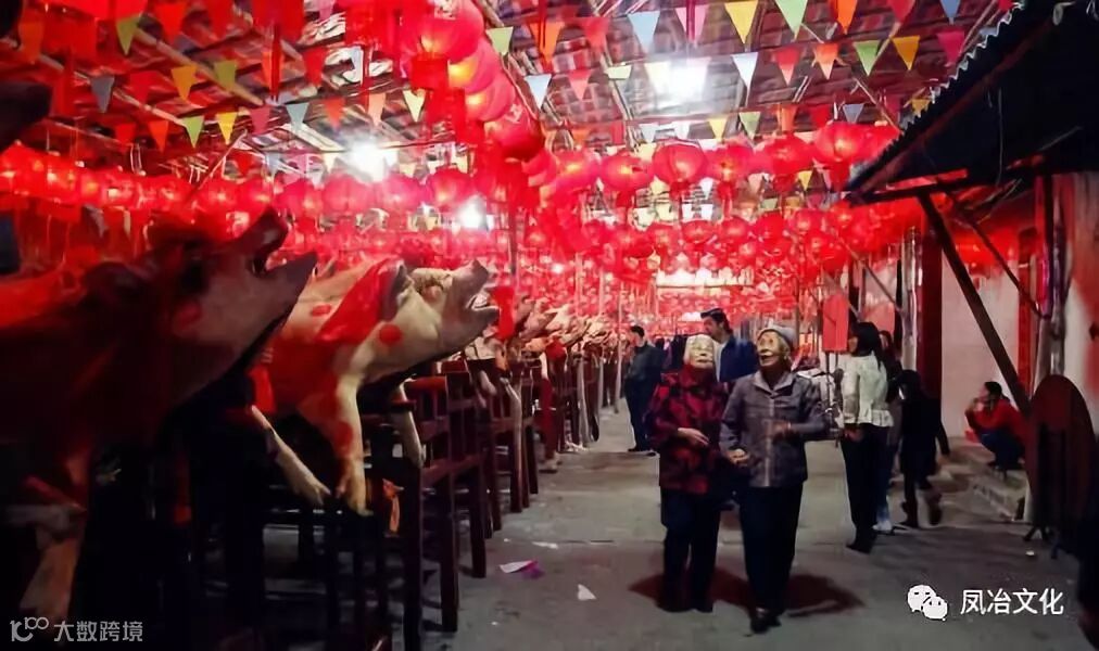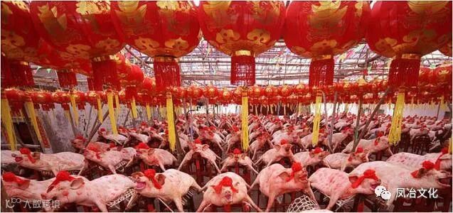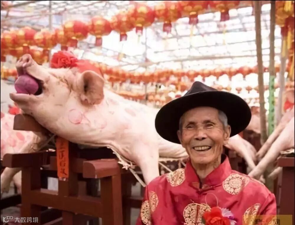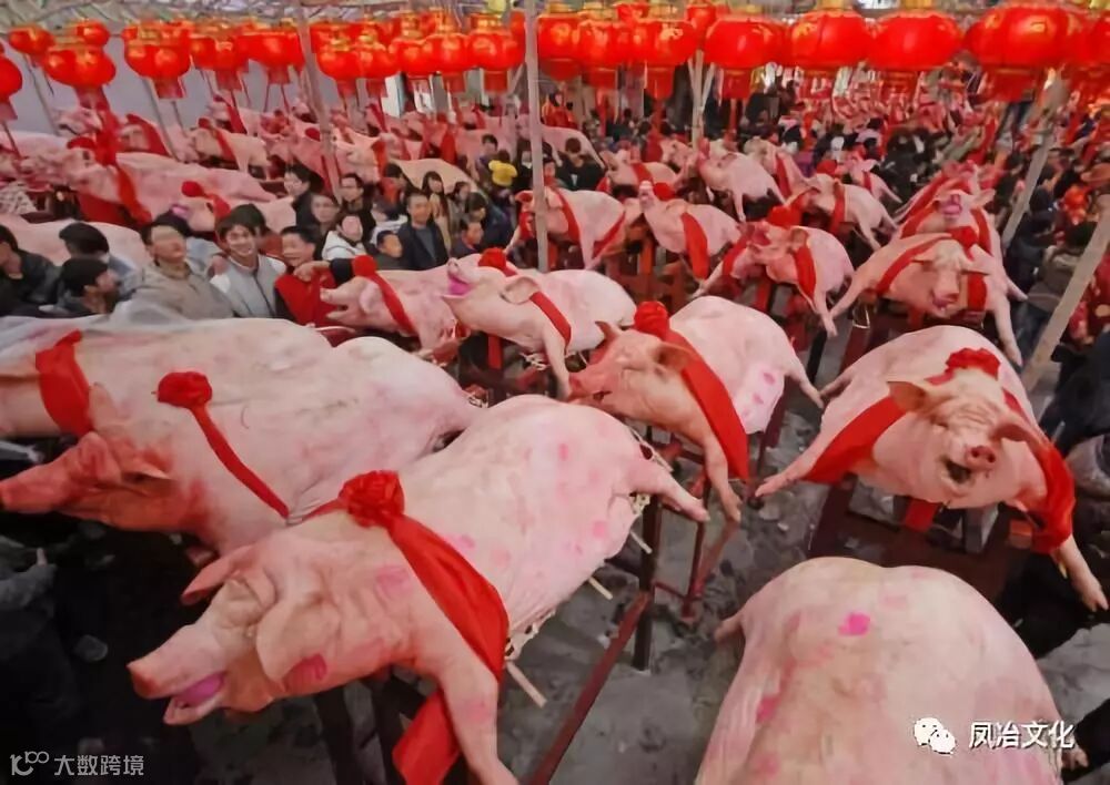 这些被当作供品的大肥猪一式高昂着头部,嘴里塞着大桔,张口,作奔跃状,雄赳赳,气昂昂,整个场面呈现一派喜气。