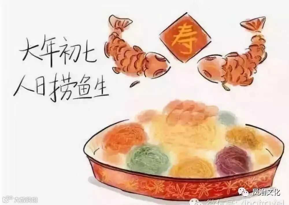 南方一些地区,民间有在人日节“捞鱼生”的习俗,捞鱼生时,往往多人围满一座,把鱼肉、配料与酱料倒在大盘里,大家站起身,挥动筷子,将鱼料捞动,口中还要不断喊到:“捞啊!捞啊!发啊!发啊!”,而且要越捞越高,以示步步高升。