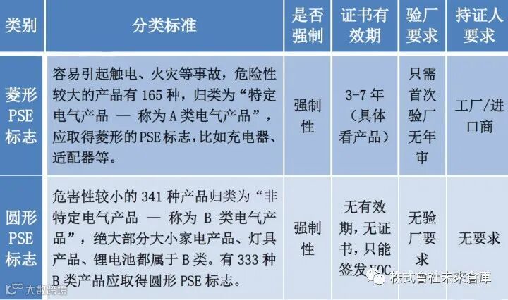 日本的DENTORL法(电器装置和材料控制法)规定,506种产品进入日本市场必须通过安全认证。其中,165种A类产品应取得菱形的PSE标志,341种B类产品应取得圆形PSE标志。