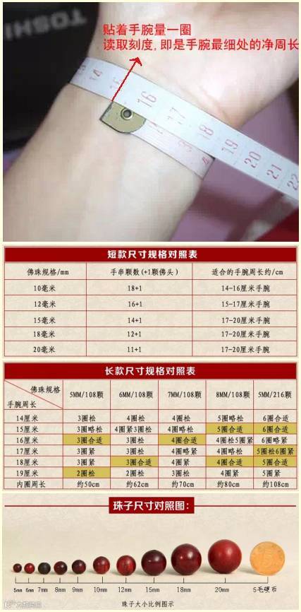 女士:适合佩戴15毫米以下的手串。手腕细的女士适合8-12毫米的。手腕粗些的适合12-15毫米的。如果喜欢豪放的时尚感,那么选择15毫米的珠子是不错的。可以根据手腕的尺寸调整颗数。