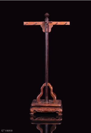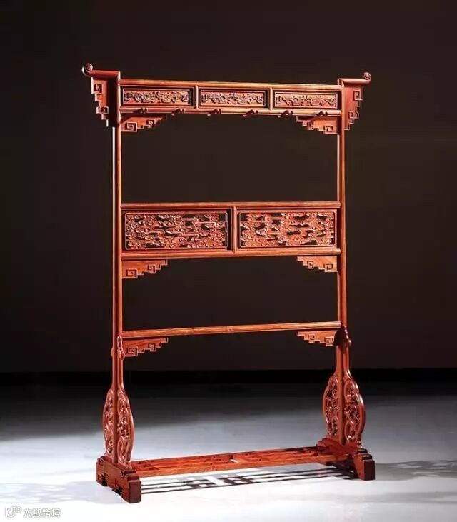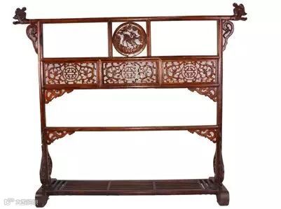 明清衣架造型典雅,装饰精美,雕刻细致,漆色光亮。明清官员头戴乌纱红缨帽,身着前后缀有补子的盘领马蹄袖长袍,故清代衣架高大,站牙立柱上设有横杆,二端出挑,雕有纹饰,衣袍搭在横杆上,谓龙门架。