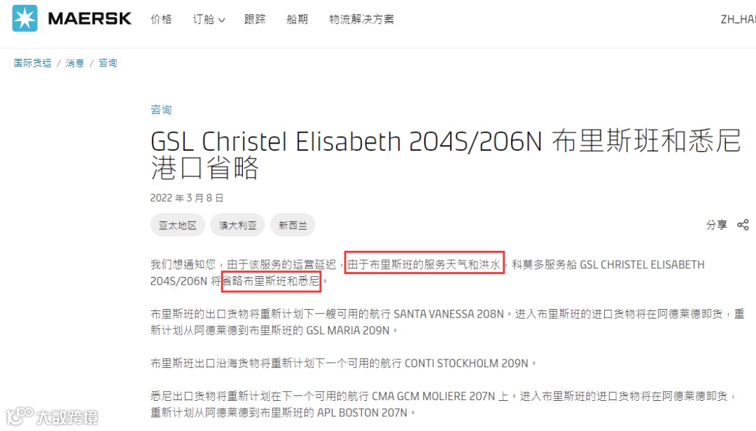 由于受天气和洪水影响,根据马士基3月8日发布的通知,有航线服务运营延迟,将跳过布里斯班和悉尼港挂靠。