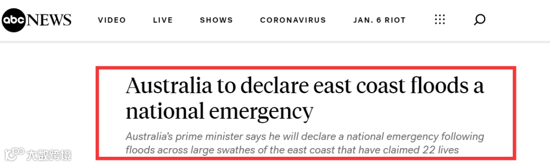 据悉,迄今为止,这场洪水已造成20人死亡,数千所房屋被毁,并造成数百万美元的物质损失。官方数据显示,新南威尔士州最大城市悉尼今年的降雨量,已达到往年全年的约80%。